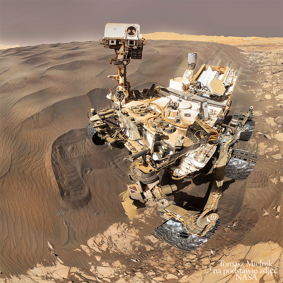 1228 dzień sondy Curiosity na Marsie. Po zrobieniu panoramy parę dni wcześniej (link do panoramy) przed wydmą, sonda wjechała w nią i zrobiła sobie piękne selfie złożone z 57 zdjęć, zrobionych kamerą Mars Hand Lens Imager (MAHLI).